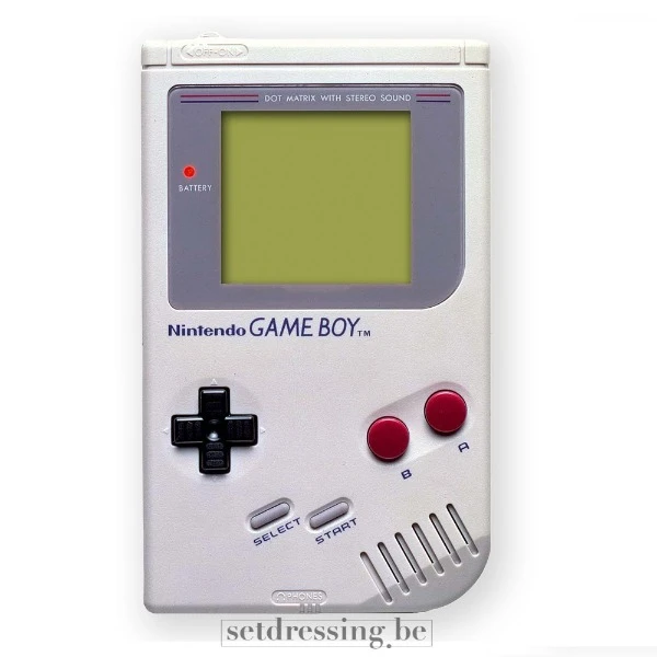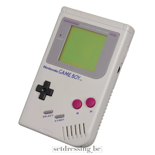Dit is een klassieke Nintendo Game Boy handheld console, gepresenteerd in zijn originele lichtgrijze behuizing met een groen getint scherm. Het beschikt over de iconische zwarte D-pad en rode 'A' en 'B' knoppen, samen met 'Start' en 'Select' knoppen. De console is gemaakt van duurzaam plastic. Dit rekwisiet is perfect voor het oproepen van nostalgie en het creëren van authentieke gaming scènes uit de jaren 80 en 90 voor film, fotoshoots of thema-evenementen. Het direct herkenbare ontwerp maakt het een veelzijdige en populaire keuze voor diverse periode-specifieke opstellingen, en vertegenwoordigt een belangrijk stukje gaming geschiedenis.