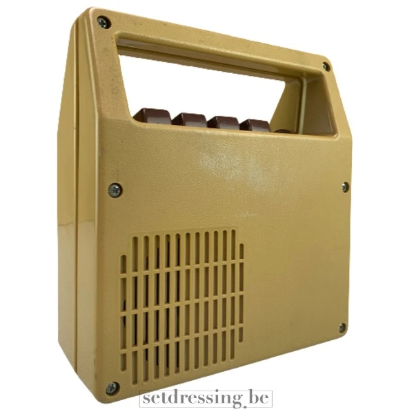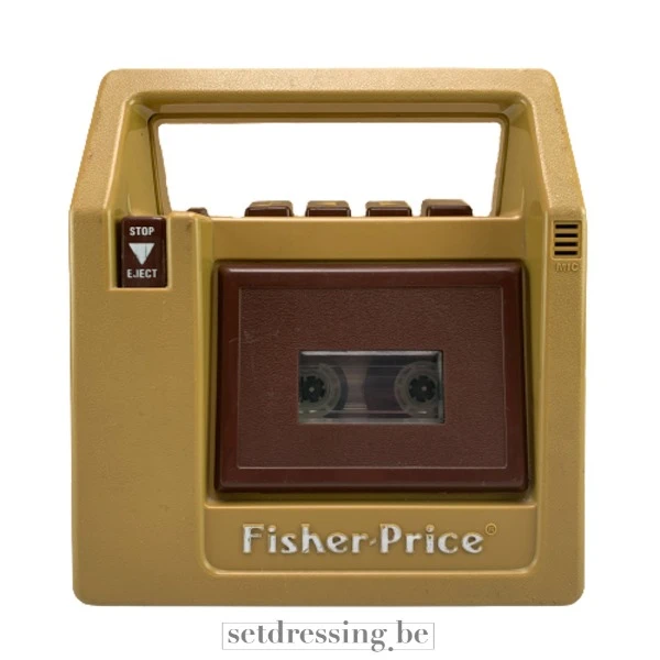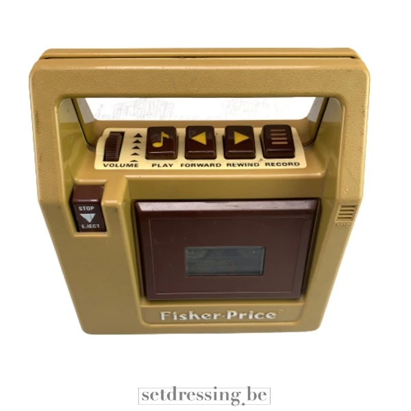 Dit is een vintage Fisher-Price cassetterecorder en -speler, met een stevig, robuust ontwerp in een mosterdgele kleur en een bruin cassettedeel. Het heeft eenvoudige, grote knoppen voor stop/eject en andere functies, en een geïntegreerd handvat voor draagbaarheid. Gemaakt van duurzaam plastic, is dit speelgoedachtige apparaat ideaal voor het creëren van nostalgische jeugdsettings, retro speelscènes, of voor het toevoegen van een specifiek periode-detail aan film- en fotoshoots uit de jaren 70 en 80. Zijn kenmerkende uiterlijk maakt het een herkenbaar en charmant rekwisiet.