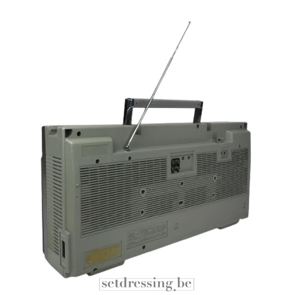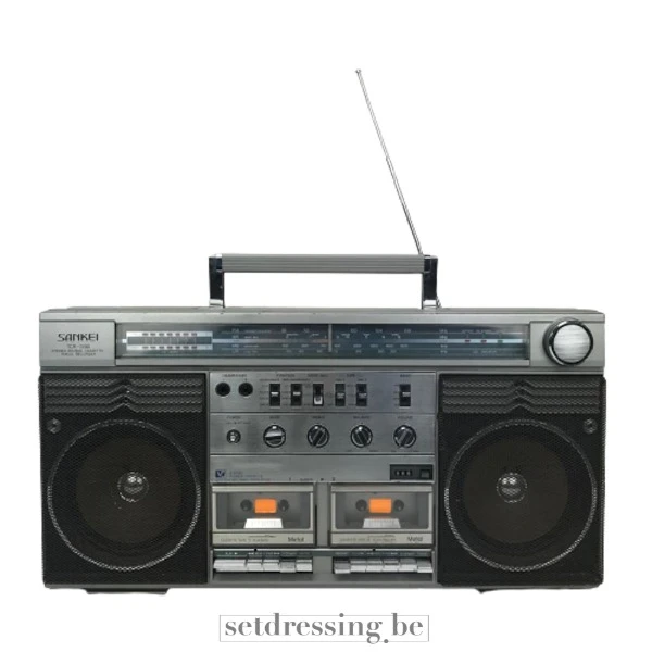 Dit is een vintage stereo boombox met een grijs en zwarte afwerking, voorzien van dubbele cassettedecks en een prominente radiotuner. Het heeft grote luidsprekerroosters aan weerszijden en een inklapbare antenne. Geconstrueerd uit een combinatie van plastic en metaal, is dit draagbare audiosysteem kenmerkend voor de straatcultuur en persoonlijk entertainment uit de jaren 80 en vroege jaren 90. Het dient als een uitstekend rekwisiet voor het creëren van authentieke periode scènes in film, fotoshoots of thema-evenementen, en voegt een herkenbaar en nostalgisch element toe aan diverse opstellingen.