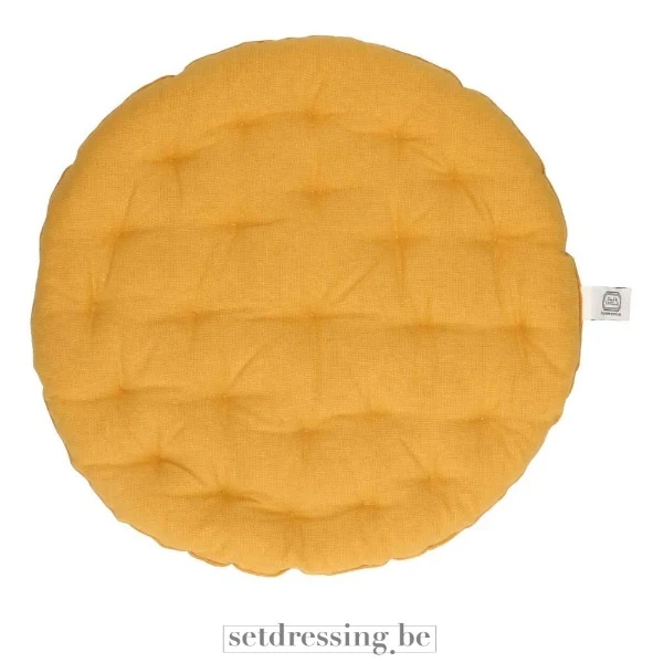 Dit is een rond zitkussen met een diameter van 50cm en een mosterdgele kleur. Het kussen is gemaakt van textiel en heeft een gewatteerde afwerking met gestikte knopen, wat zorgt voor een gestructureerde uitstraling. Het kussen is ontworpen om een comfortabele zitplaats te bieden op de grond of op meubilair. Dit zitkussen is geschikt voor gebruik in filmsets, fotoshoots, theatervoorstellingen of evenementen waar een warme, uitnodigende of retro sfeer gewenst is. Het is eenvoudig te verplaatsen en te hanteren.