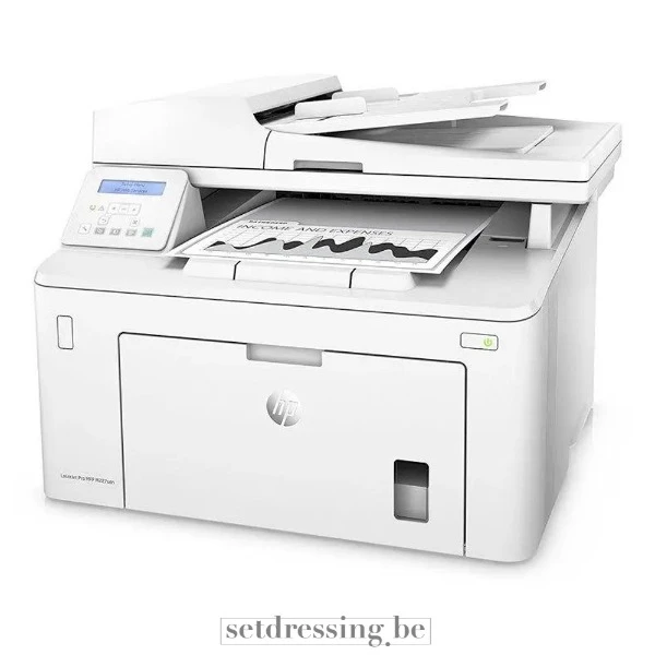 This is a modern, white all-in-one printer with scanning and copying capabilities. The design is sleek and contemporary, featuring multiple trays and an intuitive control panel with a small digital display. It is primarily constructed from white plastic, giving it a clean and professional appearance. This printer is an ideal prop for modern office sets, home office environments, or contemporary commercial spaces in film, photo shoots, and event staging. Its up-to-date design ensures it fits seamlessly into current-day scenes, providing a realistic and functional prop.