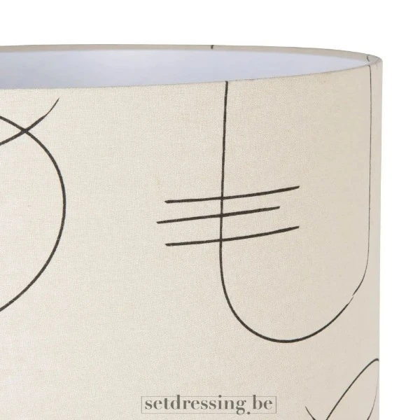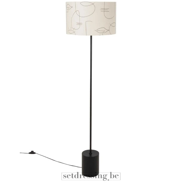 Dit is een moderne vloerlamp met een slanke zwarte metalen paal die oprijst uit een cilindervormige zwarte voet. De lamp is afgewerkt met een trommelvormige kap van een lichtgekleurde stof, mogelijk crème of gebroken wit, versierd met minimalistische lijntekeningen van abstracte gezichten. De metalen constructie van de paal en de voet zorgt voor stabiliteit en een strakke uitstraling. Dit object biedt gediffuseerd sfeerlicht en een eigentijdse artistieke toets. Het is geschikt voor het toevoegen van een moderne esthetiek aan woonkamers, studio's of stijlvolle kantooromgevingen. Dit item dient als een functionele en decoratieve prop voor hedendaagse interieurscènes in film, fotografie en evenementen.