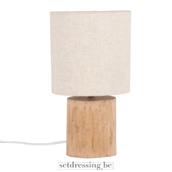 Moderne houten tafellamp met beige lampenkap. Lampvoet E14.