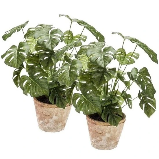 Kunstmatige Monstera plant met grote, groene bladeren en kenmerkende inkepingen. De plant staat in een terracotta pot met een verweerde uitstraling. Het materiaal is kunststof. Geschikt voor het creëren van een tropische of natuurlijke sfeer in diverse settings.