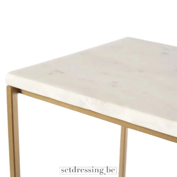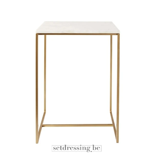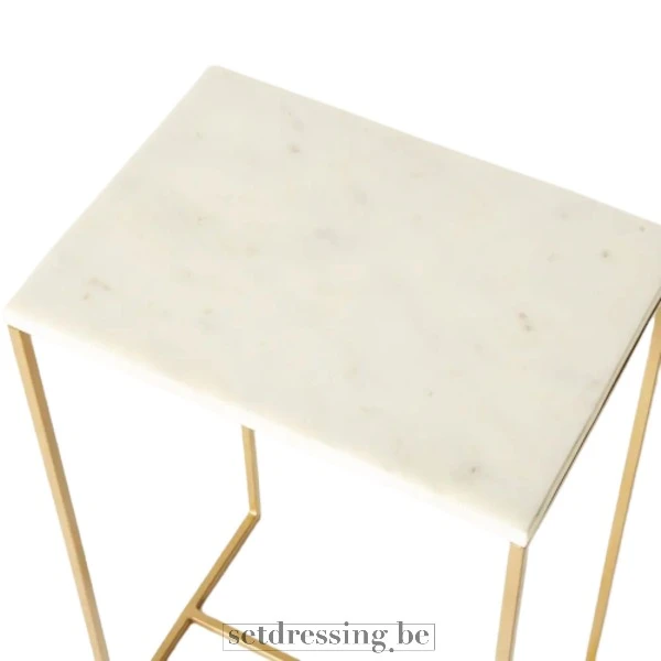 Elegante bijzettafel met een wit marmeren blad en een messing onderstel. Met een hoogte van 60 cm brengt deze minimalistische maar luxe tafel een verfijnde uitstraling in elke setting. Ideaal voor filmsets, fotoshoots en eventstyling. Enkel geschikt voor binnengebruik.