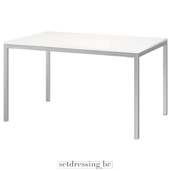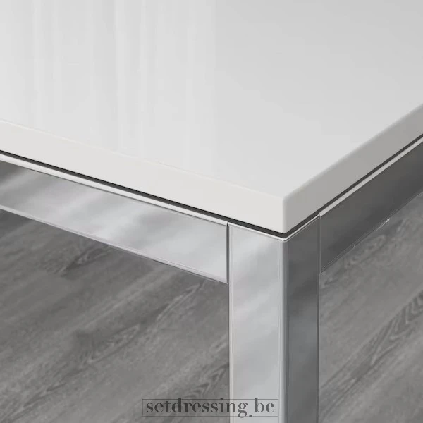 Grote glanzende witte tafel met een chromen metalen onderstel. Met een afmeting van 180 cm x 85 cm biedt deze moderne en minimalistische tafel een strakke en professionele uitstraling. Het duurzame oppervlak is eenvoudig te reinigen, ideaal voor filmsets, kantoorscènes, fotoshoots en eventstyling. Enkel geschikt voor binnengebruik.