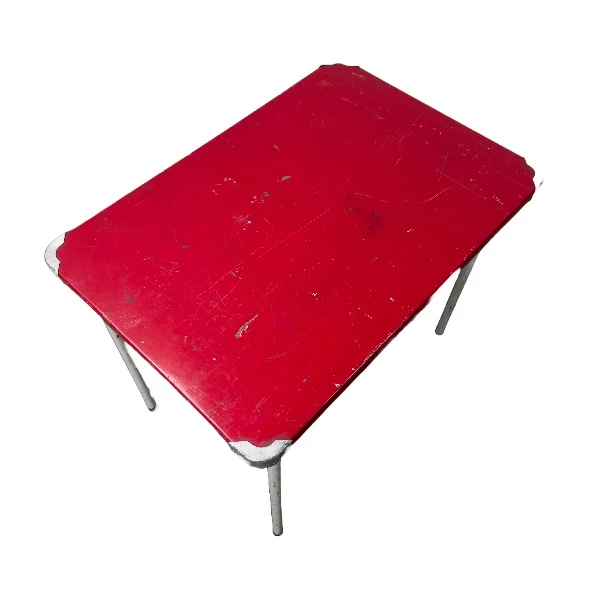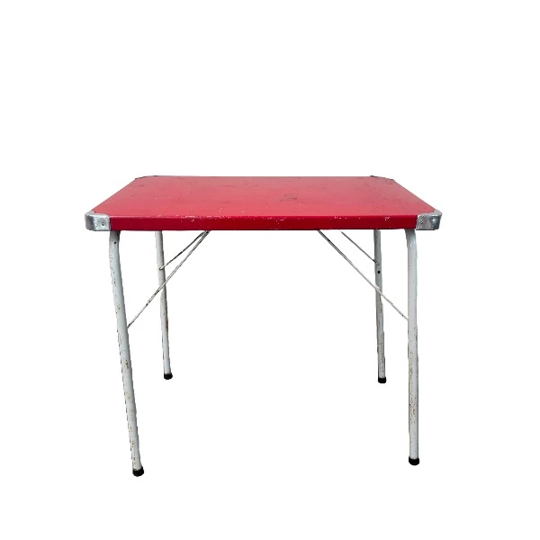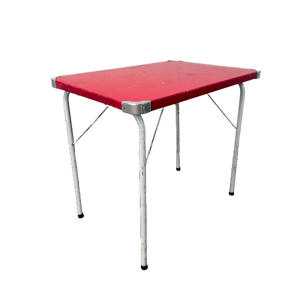 Opklapbaar kampeertafeltje van 80cm x 55cm met een tafelhoogte van 72cm. Dit lichte en draagbare tafeltje heeft een rood blad met metalen poten en verstevigde hoeken. Vertelt veel gebruikssporen. Ideaal voor outdoor scènes, kampeeropstellingen en rustieke filmsets.