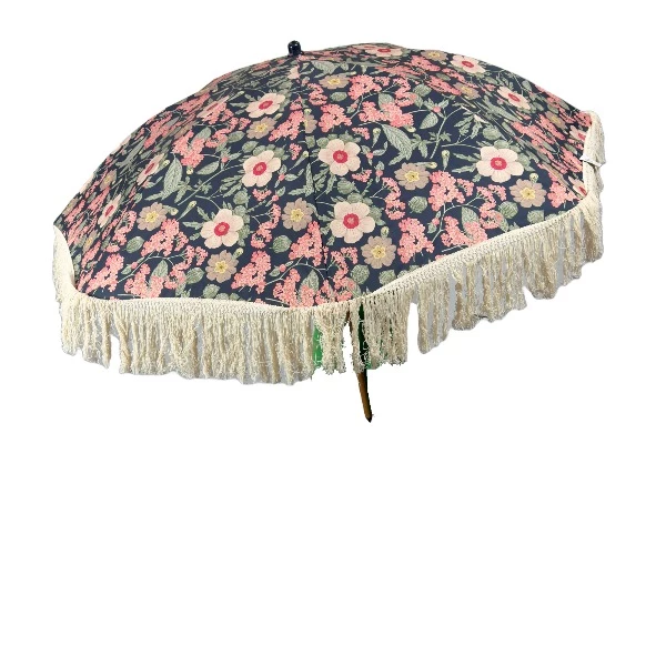 Dit is een vintage-stijl parasol met een donkerblauw doek, versierd met een levendig bloemenpatroon in roze, groen en wit. De rand van de parasol is afgewerkt met een crèmekleurige franje, wat bijdraagt aan de retro uitstraling. Dit object roept een charmante, zomerse sfeer op en is perfect voor strandscènes, picknicks of als decoratie bij evenementen en themafeesten. Ideaal voor fotoshoots, filmsets en theatervoorstellingen die een vleugje nostalgie vereisen.