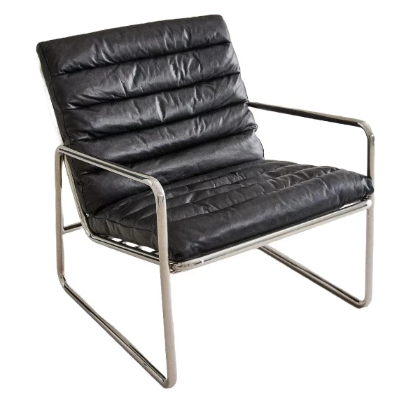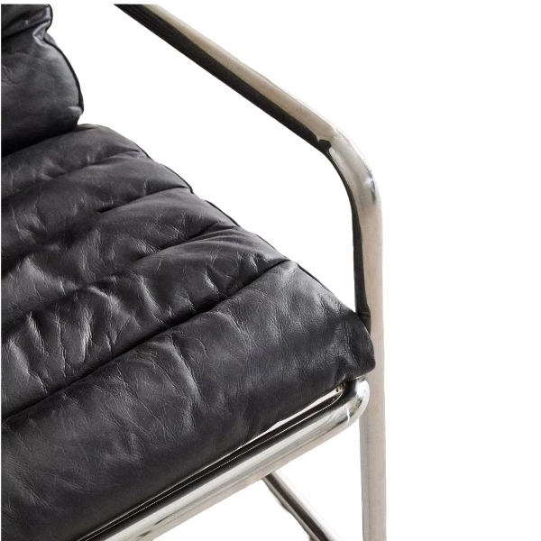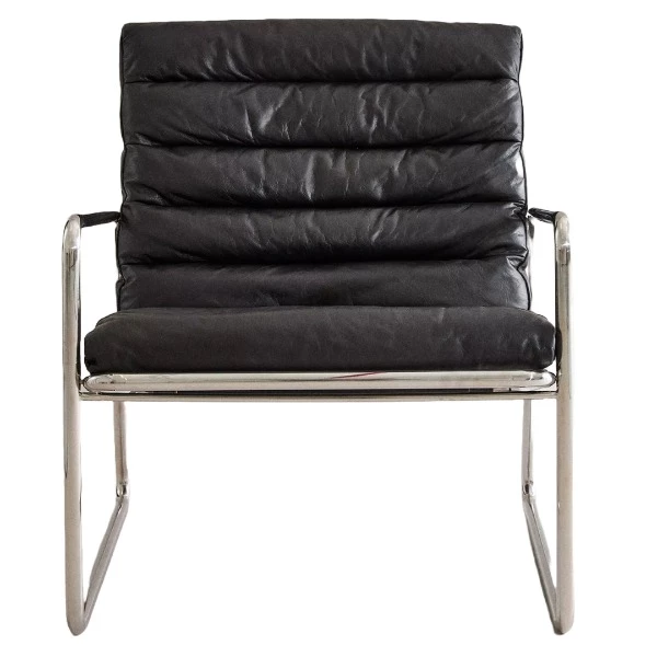 Deze zwarte lederen fauteuil is een modern en stijlvol zitmeubel. De stoel heeft een metalen frame met een gepolijste afwerking en een zitting en rugleuning van gewatteerd zwart leer. Het ontwerp is minimalistisch en elegant. Ideaal voor filmsets, fotoshoots en evenementen waar een strakke, moderne uitstraling gewenst is. De stoel biedt comfort en een visueel aantrekkelijk element.