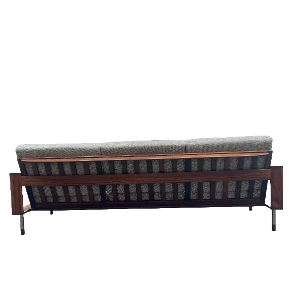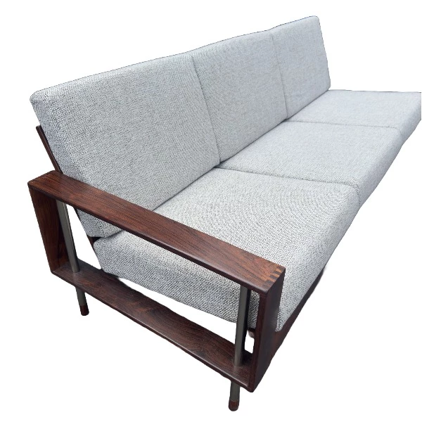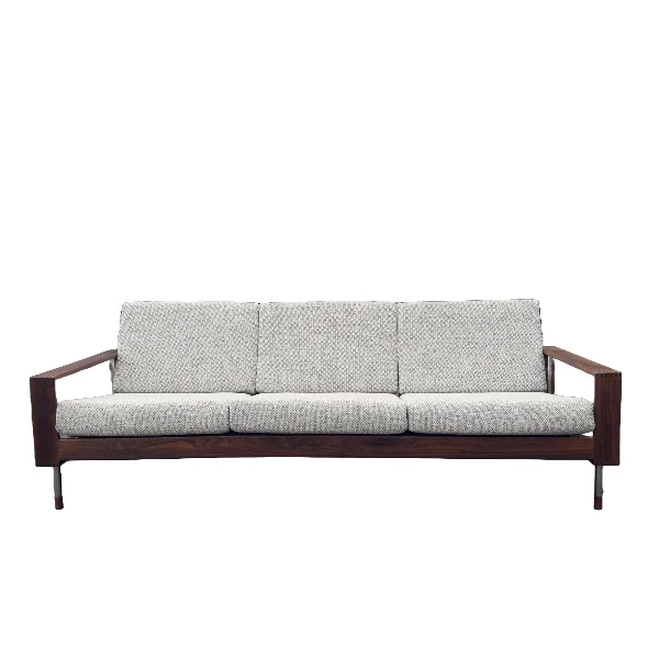 Dit is een vintage driezitsbank met een donkerbruin houten frame en lichtgrijs gestoffeerde kussens. Het frame heeft rechte, minimalistische lijnen en rust op slanke, metalen poten. De zitting en rugleuning bestaan uit drie afzonderlijke, zacht ogende kussens. Het ontwerp doet denken aan mid-century modern meubilair. Deze bank is een stijlvolle prop voor interieurscènes, studio-opstellingen, woonkamers of wachtruimtes in film, televisie en fotografie.