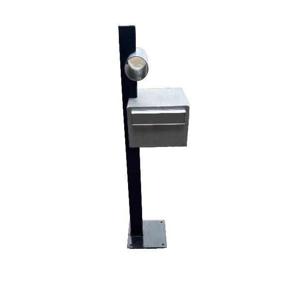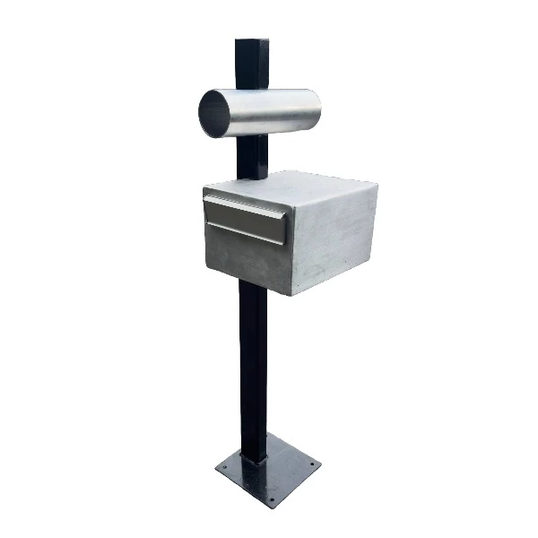 Vrijstaande brievenbus en krantenrol. De constructie bestaat uit een matzwarte, rechte stalen staander met een vierkante grondplaat en een geïntegreerde, rechthoekige brievenbus. De brievenbus is vervaardigd uit geborsteld, zilverkleurig roestvrij staal en heeft een horizontale gleuf. Boven de brievenbus is een zilverkleurige, cilindrische krantenrol gemonteerd. Dit object is geschikt voor moderne, strakke, architecturale of stedelijke decors.