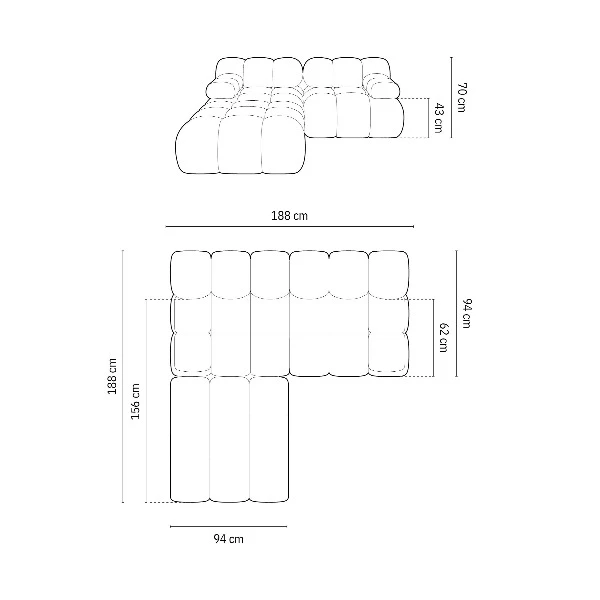 Modulaire designhoekbank in diepblauw. Dit zitelement bestaat uit drie delen: een chaise longue en twee zitmodules, die samen een hoekconfiguratie vormen. De bank heeft een iconisch, gebult of 'gezwollen' ontwerp, kenmerkend voor de Camaleonda-stijl. De bekleding is een fluweelachtige of zachte stof in een effen marineblauw. De constructie is volledig gestoffeerd, inclusief de ronde rug- en armleuningen, waardoor het een luxueuze uitstraling heeft.