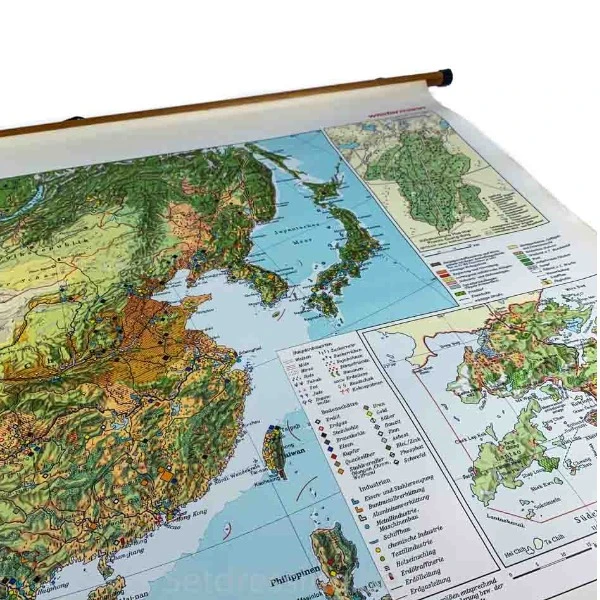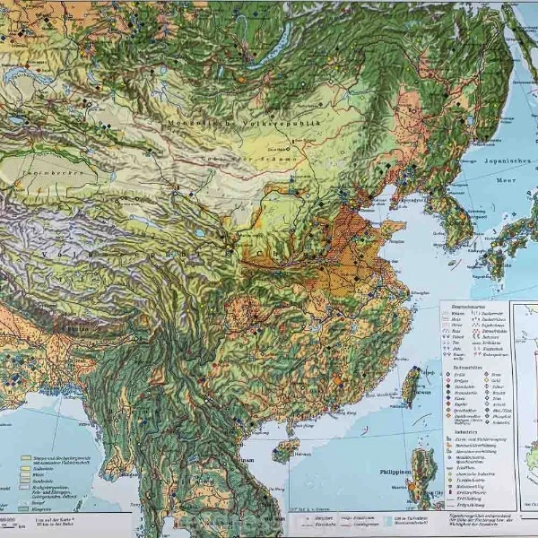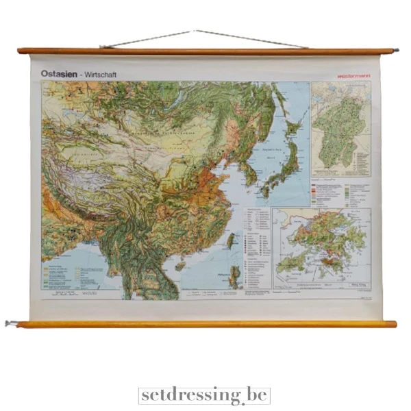 Dit is een vintage educatieve schoolkaart van Oost-Azië. De kaart is gedrukt op papier met houten ophangstangen en toont gedetailleerde geografische kenmerken, landschappen en steden in verschillende kleuren. Het heeft een verweerde, vintage uitstraling met duidelijke gebruikssporen. Geschikt voor decoratieve doeleinden in sets die een educatieve, geografische of historische context vereisen. De kaart bevat ook kleine inzetkaarten en legenda's.