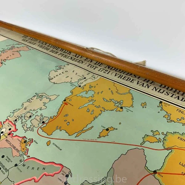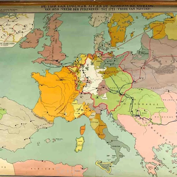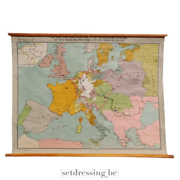 Dit is een vintage educatieve schoolkaart van Europa, specifiek de periode 1871-1914. De kaart is gedrukt op papier met houten ophangstangen en toont de politieke grenzen en geografische kenmerken van Europa in die tijd. Het heeft een verweerde, vintage uitstraling met duidelijke gebruikssporen. Geschikt voor decoratieve doeleinden in sets die een historische, educatieve of politieke context vereisen.