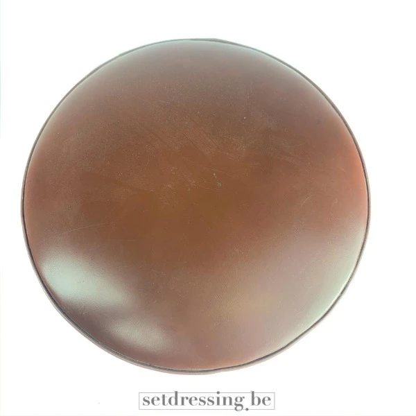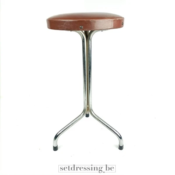 Dit is een metalen en leren kruk met een vaste hoogte. Het heeft een ronde, gewatteerde zitting bedekt met bruin leer. De zitting wordt ondersteund door een enkele verchroomde metalen paal. De basis is een driepootontwerp met drie verchroomde poten. De kruk is niet verstelbaar. Het leer vertoont enkele gebruikssporen, passend bij de leeftijd. Deze kruk is geschikt voor gebruik in industriële omgevingen, werkplaatsen of als een vintage rekwisiet in film en fotografie. Het bruine leer voegt een unieke touch toe aan het ontwerp.