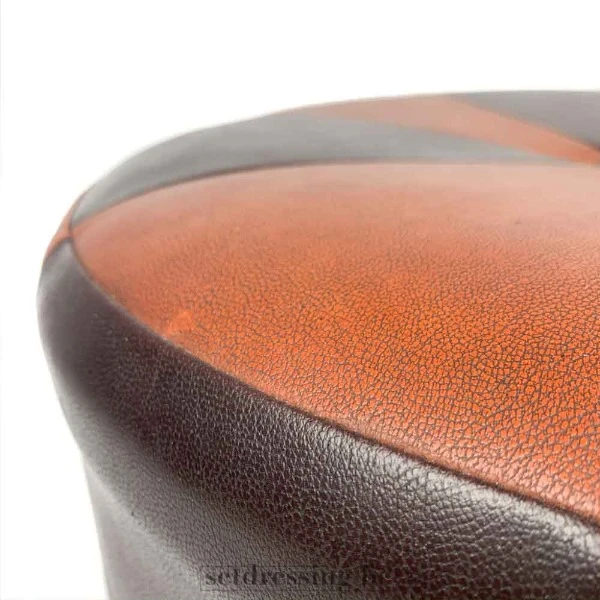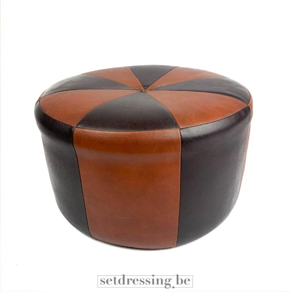 Dit is een ronde, lage poef of ottoman. Het heeft afwisselende panelen van donkerbruin en tan leer, waardoor een gesegmenteerd ontwerp ontstaat. De ottoman heeft een cilindrische vorm met een licht afgeronde bovenkant. Het leer lijkt aan elkaar gestikt te zijn, wat een decoratief element toevoegt. De ottoman vertoont minimale gebruikssporen. Dit stuk is geschikt voor gebruik als rekwisiet in interieurscènes, lounges of als decoratief accent in diverse settings.