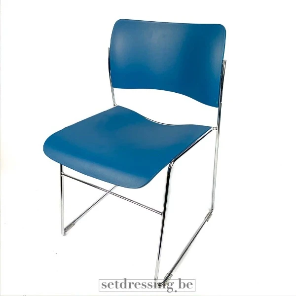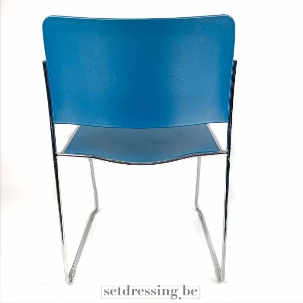 Dit is een blauwe stapelbare stoel met een metalen frame. De zitting en rugleuning zijn gemaakt van een gegoten plastic materiaal. De stoel is ontworpen voor gebruik binnenshuis en is geschikt voor evenementen, vergaderingen of als extra zitplaats. Het compacte ontwerp van de stoel zorgt voor efficiënte opslag wanneer hij niet in gebruik is. De blauwe kleur zorgt voor een strakke en professionele uitstraling. Het metalen frame biedt stabiliteit en duurzaamheid. De stoel meet ongeveer 76 cm in hoogte.
