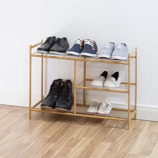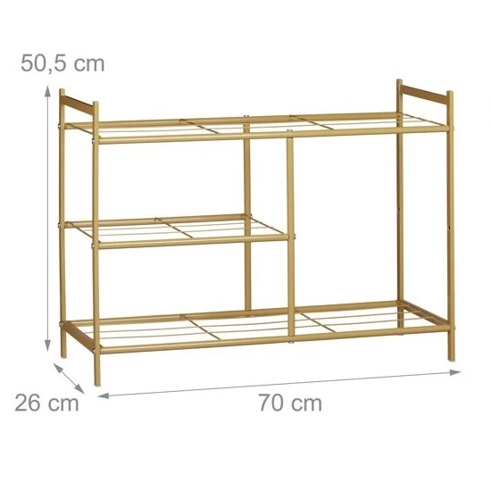 Dit is een bruin schoenenrek van 70 cm breed, gemaakt uit gepoedercoat metaal. Het rek biedt plaats voor maximaal 8 paar schoenen, verdeeld over meerdere niveaus. Dankzij het compacte ontwerp is het ideaal voor het organiseren van schoenen in gangen, hallen of kleedkamers. De warme bruine kleur en het eenvoudige design maken het geschikt voor diverse interieurstijlen. Enkel geschikt voor binnengebruik.