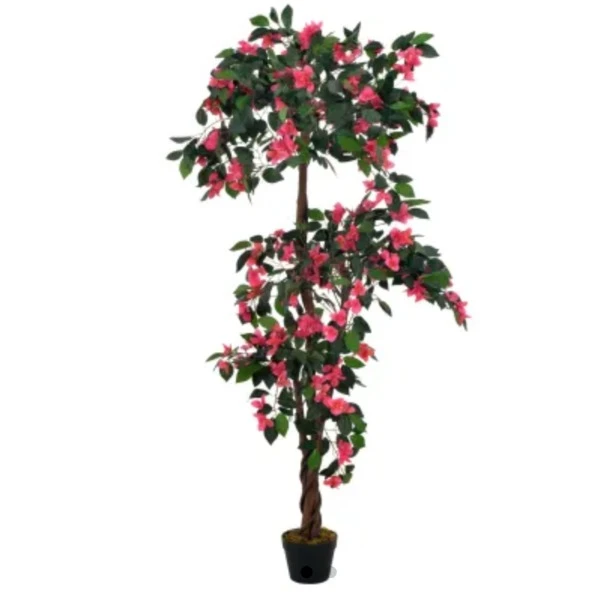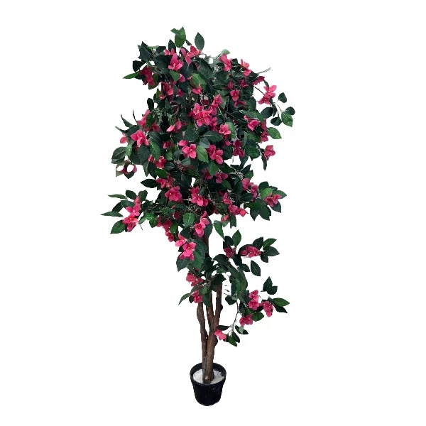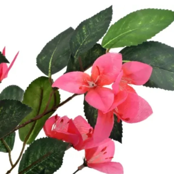 Dit is een kunstmatige Rhododendron plant met roze bloemen in een pot. De plant heeft een slanke stam met groene bladeren en talrijke roze bloemen. De bladeren en bloemen zijn gemaakt van synthetisch materiaal. De plant is geplaatst in een zwarte plastic pot. Dit decoratieve stuk is geschikt voor interieursets, evenementen en fotoshoots. Het vereist geen onderhoud en voegt een kleurrijk, natuurlijk element toe aan de ruimte.