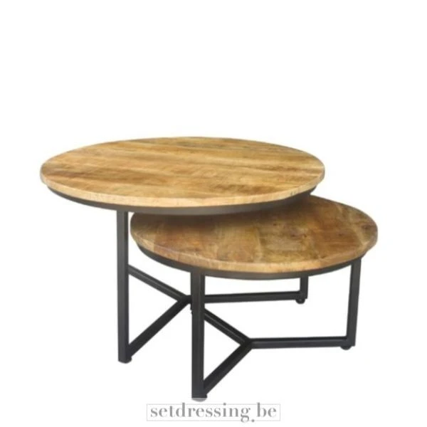 Ronde bijzettafel uit hout met een zwart metalen onderstel. Het tafelblad heeft een natuurlijke houtafwerking en het stevige metalen frame zorgt voor stabiliteit en een industriële uitstraling. Met een diameter van 60 en 75cm zijn deze tafels ideaal voor filmsets, fotoshoots en eventstyling.