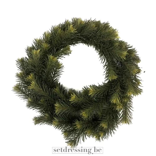 Dit is een kunstmatige dennenkrans met donkergroene naalden en subtiele lichtgele accenten aan de uiteinden. De krans is gemaakt van synthetisch materiaal en heeft een ronde vorm. Geschikt voor decoratieve doeleinden in sets die een seizoensgebonden, natuurlijke of feestelijke sfeer vereisen.