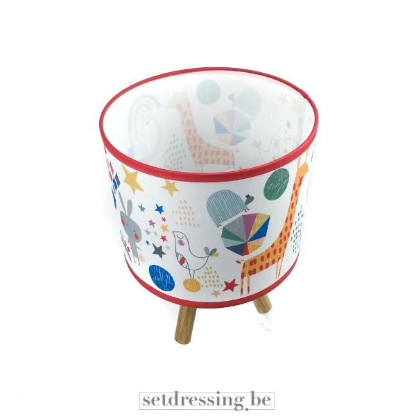 Dit is een kleine tafellamp ontworpen voor kinderkamers, met een stoffen drumkap versierd met kleurrijke cartoonillustraties van dieren, regenbogen en sterren. De boven- en onderrand van de kap zijn afgewerkt met een rode bies. De lamp wordt ondersteund door drie korte, lichte houten poten met witte uiteinden, die stabiliteit bieden. Het speelse ontwerp en de zachte verlichting maken hem geschikt voor een kinderkamer, peuterkamer of elke set die een vrolijke en vriendelijke sfeer vereist. Dit stuk functioneert als een decoratief en praktisch verlichtingsrekwisiet.