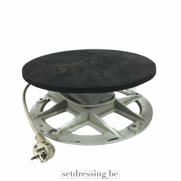 Dit is een elektrische presentatie draaitafel, ontworpen om objecten te roteren voor tentoonstellings- of filmdoeleinden. Het heeft een plat, cirkelvormig zwart bovenvlak voor het plaatsen van items, ondersteund door een stevige, open frame grijze metalen basis. Een witte stroomkabel met een Europese tweepins stekker komt uit de basis. Gemaakt van metaal met een rubberen of plastic bovenkant, biedt deze draaitafel een soepele, consistente rotatie. Het is een ideaal rekwisiet voor productfotografie, het tonen van items in winkeldisplays, of het creëren van dynamische opnamen van objecten in film- en commerciële producties, en biedt een functionele en veelzijdige oplossing voor diverse visuele behoeften.