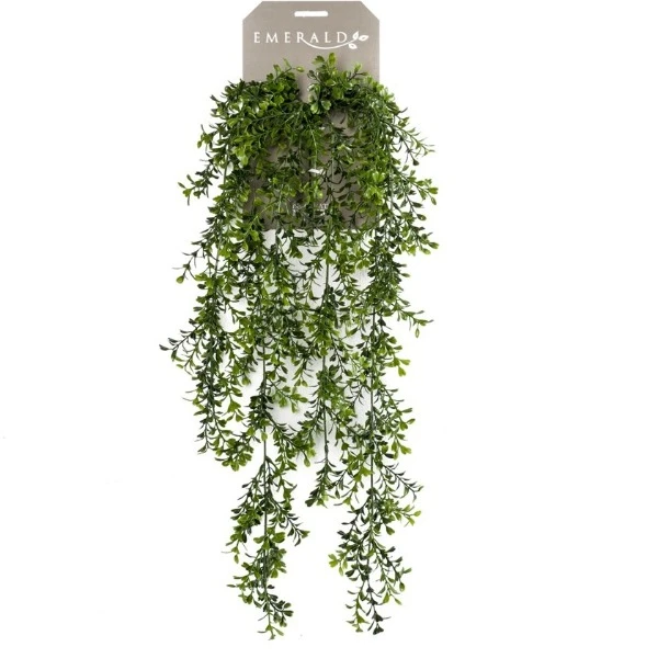 Dit is een kunstmatige hangplant, specifiek boxwood, met kleine, groene bladeren. De bladeren zijn gemaakt van synthetisch materiaal. Het product is ontworpen om aan een muur of oppervlak te worden bevestigd. Dit decoratieve stuk is geschikt voor interieursets, evenementen en fotoshoots. Het vereist geen onderhoud en voegt een natuurlijke, hangende element toe aan de ruimte.