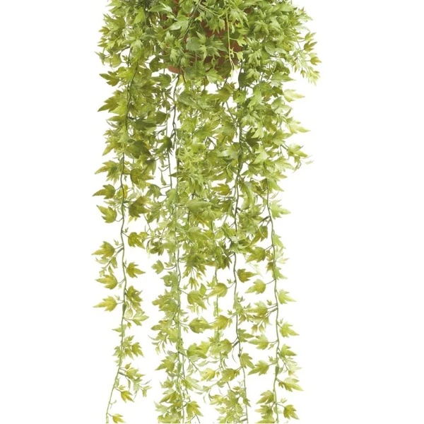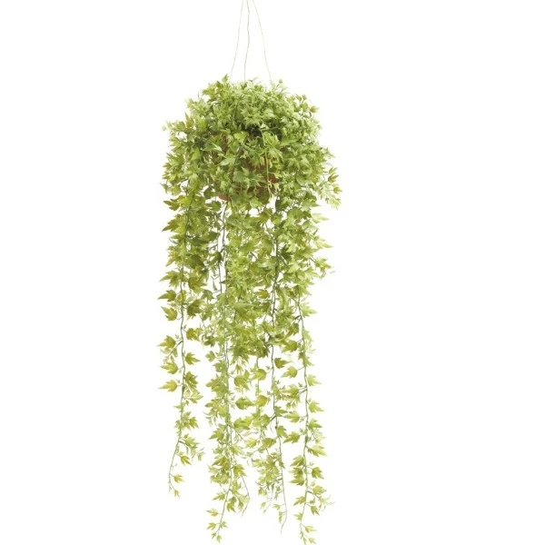 Dit is een kunstmatige hangplant met kleine, lichtgroene bladeren die naar beneden hangen. De bladeren zijn gemaakt van synthetisch materiaal. Dit decoratieve stuk is geschikt voor interieursets, evenementen en fotoshoots. Het vereist geen onderhoud en voegt een natuurlijke, hangende element toe aan de ruimte. De plant is ontworpen om opgehangen te worden.