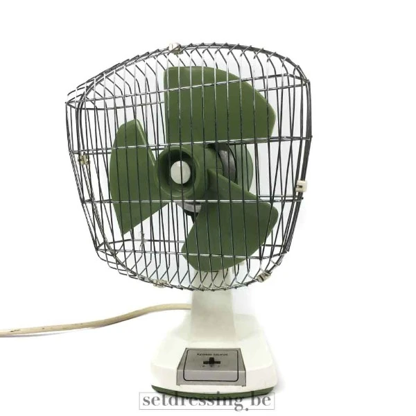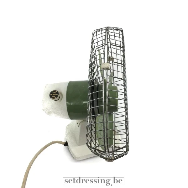 Dit is een vintage tafelventilator met een kenmerkend retro design. Het beschikt over een kooi-achtig metalen rooster in een donkere kleur, dat drie groene plastic bladen omhult. De ventilatorkop is gemonteerd op een witte, taps toelopende plastic basis die een schakelaar voor bediening bevat. Een wit stroomsnoer komt uit het apparaat. Gemaakt van metaal en plastic, is deze ventilator een geschikt rekwisiet voor periode decors vanaf het midden van de 20e eeuw. Het voegt een authentiek tintje toe aan kantoor-, slaapkamer- of woonkamer scènes voor film-, fotografie- en theaterproducties, en draagt bij aan een gevoel van historische ambiance.