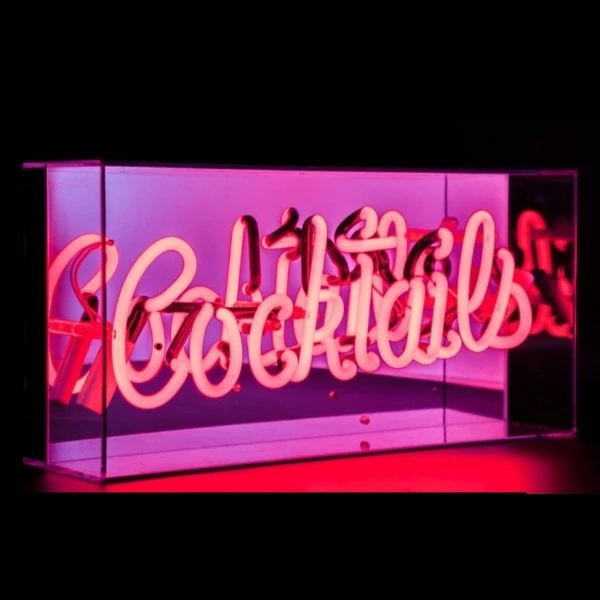 Dit is een verlicht "Cocktails" bord met roze neonbuizen ingesloten in een heldere acrylbox. Het neon-schrift gloeit fel, wat een levendig en aandachttrekkend effect creëert. De heldere behuizing laat het licht het primaire visuele element zijn, terwijl de neonbuizen worden beschermd. Het opvallende ontwerp maakt het ideaal voor bar-, feest-, retro- of moderne lounge-settings. Dit stuk functioneert als een decoratief verlichtingsrekwisiet, perfect voor het creëren van een levendige sfeer of een specifieke esthetische verklaring in film, fotografie of evenementen.