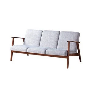 Dit is een driezitsbank met een lichtgekleurde stoffen bekleding en houten armleuningen. De bank heeft een mid-century modern design met strakke lijnen en een laag profiel. De stof is lichtgrijs, wat een neutrale achtergrond biedt. De houten armleuningen en poten zijn gemaakt van een middentoon hout, wat een warm contrast toevoegt aan de bekleding. De bank heeft drie afzonderlijke zitkussens en rugkussens. De materiaalsamenstelling omvat stoffen bekleding en hout. Ideaal voor het creëren van een stijlvolle en comfortabele setting in diverse prop-opstellingen.