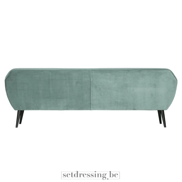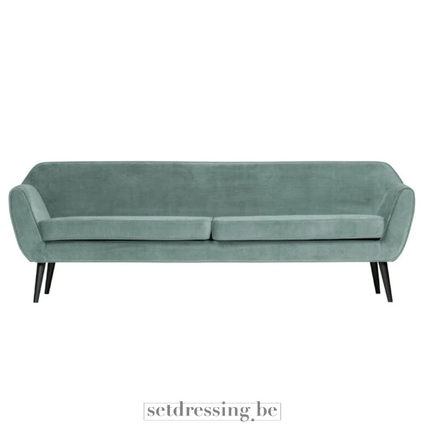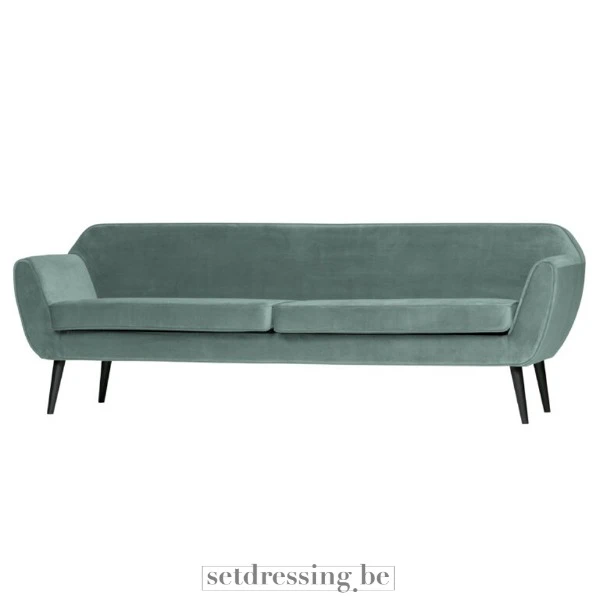 Dit is een driezitsbank met een lichtblauwe fluwelen bekleding. De bank heeft een strak, modern ontwerp met afgeronde armleuningen en taps toelopende zwarte poten. De zitkussens zijn stevig en bieden comfortabele ondersteuning. Het fluwelen materiaal voegt een vleugje verfijning toe aan het stuk. Deze bank is geschikt voor diverse omgevingen, waaronder woonkamers, lounges en evenementenruimtes. De neutrale kleur en het veelzijdige ontwerp maken het gemakkelijk te integreren in verschillende interieurstijlen.