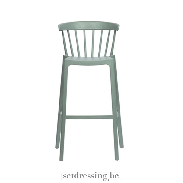 Dit is een groene plastic barkruk. De kruk heeft een traditionele Windsor-stijl rugleuning met verticale spijlen en een gebogen bovenkant. De zitting is plat en massief. Het frame is gemaakt van een gegoten plastic materiaal. De kruk heeft vier rechte poten verbonden door een cirkelvormige voetensteun. De kleur is een gedempte, effen groene tint. Deze barkruk is geschikt voor hoge aanrechtbladen of bars. Het biedt zitplaats aan één persoon en is ontworpen voor binnen- of buitengebruik. Het plastic materiaal maakt het lichtgewicht en gemakkelijk schoon te maken.