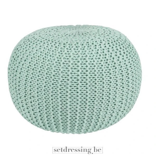 Dit is een turquoise stoffen poef. De poef is rond en heeft een gebreide of gehaakte textuur. Het materiaal lijkt een zachte, geweven stof met een duidelijk patroon. De poef heeft een diameter van ongeveer 45 cm. Hij is gevuld en behoudt een stevige, ronde vorm. De kleur is een lichte, effen turquoise tint. Deze poef kan gebruikt worden als voetenbankje, extra zitplaats of decoratief accent. Hij is geschikt voor diverse interieurinstellingen. De stoffen constructie zorgt voor een zacht, tactiel oppervlak.