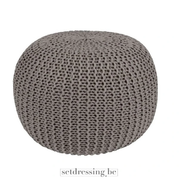 Dit is een gebreide poef. De poef is rond en heeft een gebreid textuurpatroon. Het materiaal is katoen. De kleur is een medium grijs. Deze poef kan dienen als extra zitplaats of als decoratief element in diverse settings. Geschikt voor rekwisietenverhuur in fotografie, film of evenementenstyling.