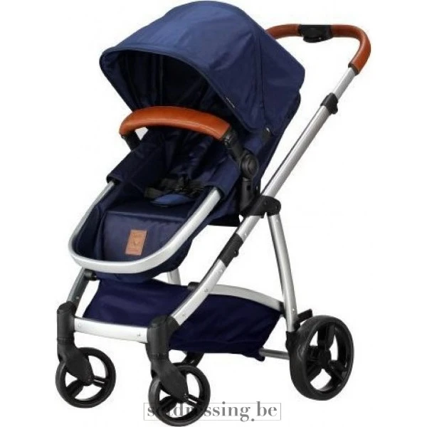 Dit is een complete modulaire kinderwagenset in het donkerblauw, met een zilverkleurig frame en bruine lederen accenten op de handgreep. De set omvat een reiswieg, een zitje en een autostoeltje, alle monteerbaar op hetzelfde onderstel. Het onderstel is voorzien van robuuste wielen en een geïntegreerde opbergmand. Dit 3-in-1 systeem biedt flexibiliteit voor diverse scènes met baby's of jonge kinderen, geschikt voor zowel binnen- als buitenopnames.