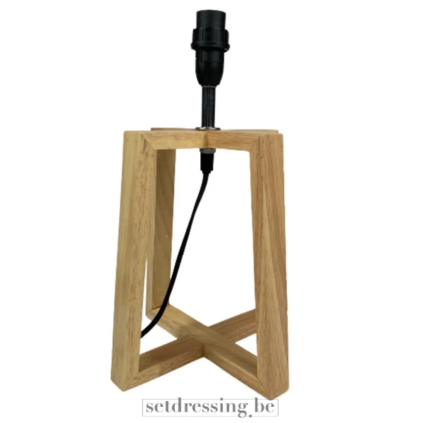 Dit is een moderne tafellampvoet vervaardigd uit lichtkleurig hout. Hij heeft een open, geometrisch ontwerp met vier verticale houten staanders die onderaan kruisen en zo een stabiele structuur vormen. Bovenaan bevindt zich centraal een zwarte lamphouder, ontworpen om een zichtbare gloeilamp te dragen. Een discrete zwarte stroomkabel steekt uit de basis. Zijn minimalistische en natuurlijke esthetiek maakt hem geschikt voor Scandinavische, eigentijdse of rustiek-geïnspireerde interieurs. Dit stuk functioneert als een fundamenteel verlichtingsrekwisiet, biedt een strak en ingetogen element aan diverse setontwerpen, en benadrukt de gloeilamp als een designkenmerk.