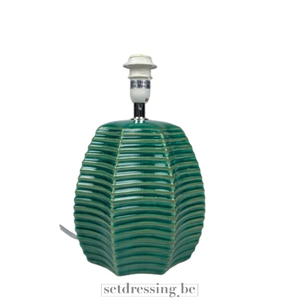 Dit is een keramische tafellampvoet in een levendige tealgroene kleur. Het heeft een uniek, gestructureerd ontwerp dat lijkt op gelaagde bladeren of organische ribbels, wat het een onderscheidende uitstraling geeft. De lampvoet is gemaakt van geglazuurd keramiek, wat zorgt voor een gladde afwerking en subtiele glans. Het is ontworpen voor een standaard lampfitting en is geschikt voor diverse interieuromgevingen. Dit object dient als een onderscheidende decoratieprop voor filmsets, fotoshoots en evenementen, en biedt een vleugje modern en toch organisch design.