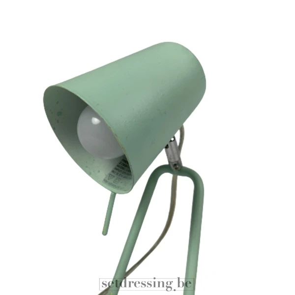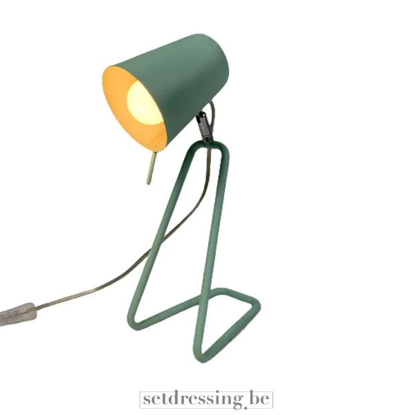Dit is een moderne metalen tafellamp in een gedempte saliegroene kleur. Het kenmerkt zich door een minimalistisch ontwerp met een kenmerkende Z-vormige voet, die stabiliteit en een eigentijdse esthetiek biedt. De lampkop is cilindervormig en verstelbaar, waardoor gerichte verlichting mogelijk is. Volledig geconstrueerd uit metaal, biedt deze lamp duurzaamheid en een strakke, matte afwerking. Het is geschikt voor taakverlichting op bureaus of als accentstuk op bijzettafels. Dit item functioneert als een stijlvolle en functionele prop voor moderne interieurscènes, kantooromgevingen of zelfs minimalistische kunstinstallaties in film, fotografie en evenementen.