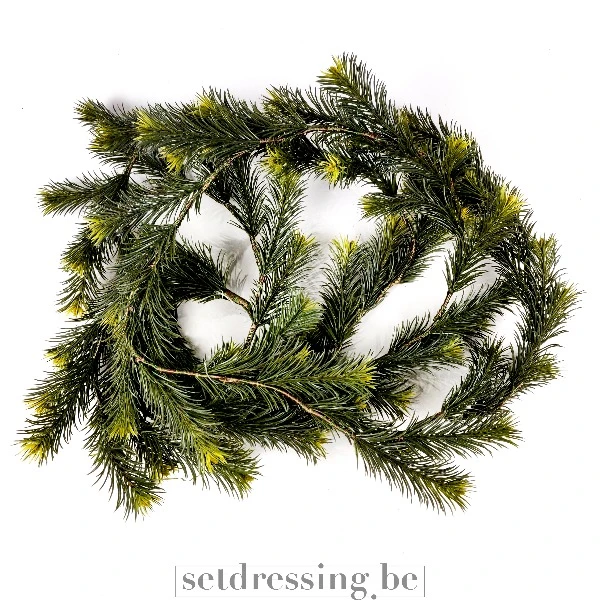 Deze kunstmatige guirlande is een decoratief element voor diverse settings. De guirlande is gemaakt van kunststof en heeft een donkergroene kleur met lichte gele accenten die een natuurlijke naaldbomenlook creëren. De guirlande is flexibel en kan op verschillende manieren worden gebruikt, zoals voor het versieren van trappen, open haarden of tafels. Geschikt voor het toevoegen van een groen element aan decors en evenementen.