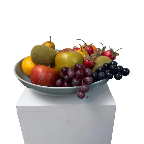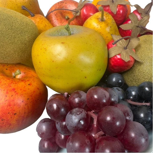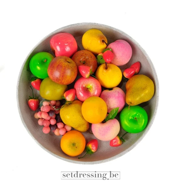 Deze set bevat een assortiment van kunstmatige vruchten. De vruchten variëren in type en kleur, waaronder appels, peren, aardbeien en druiven. De vruchten zijn gemaakt van kunststof en hebben een realistische uitstraling. Geschikt voor decoratieve doeleinden in sets, fotoshoots en evenementen.